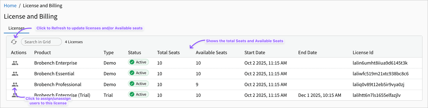 Under the License/Billing setup tab, you can view available licenses, assign, or unassign licenses to users.