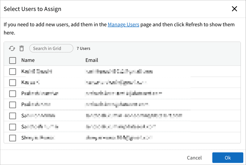 Click the Assign Users button or the + icon to open the user selection dialog as shown below.