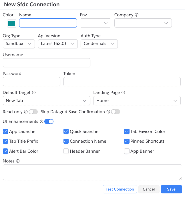 Selecting Sfdc Connection opens the following dialog: