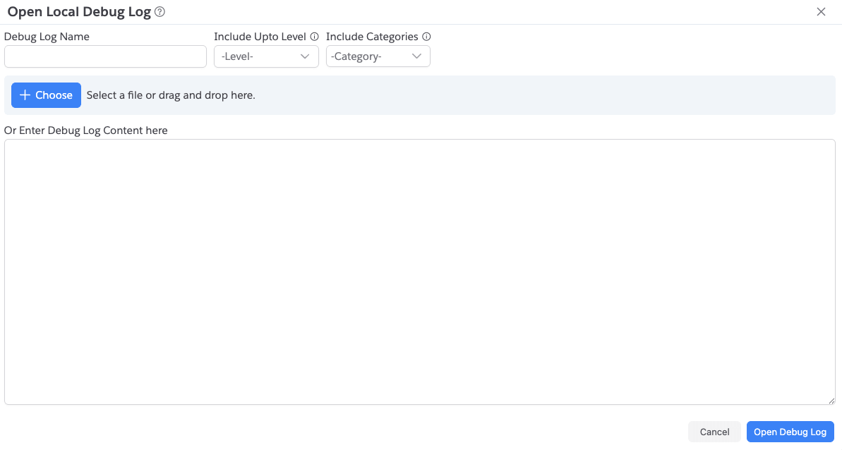Open Local Debug Log dialog supports:
