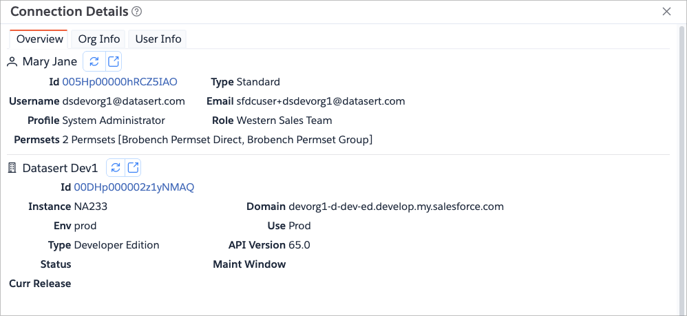 Click on the Connection Menu -> <Connection Username> to show the details of the current Salesforce user and