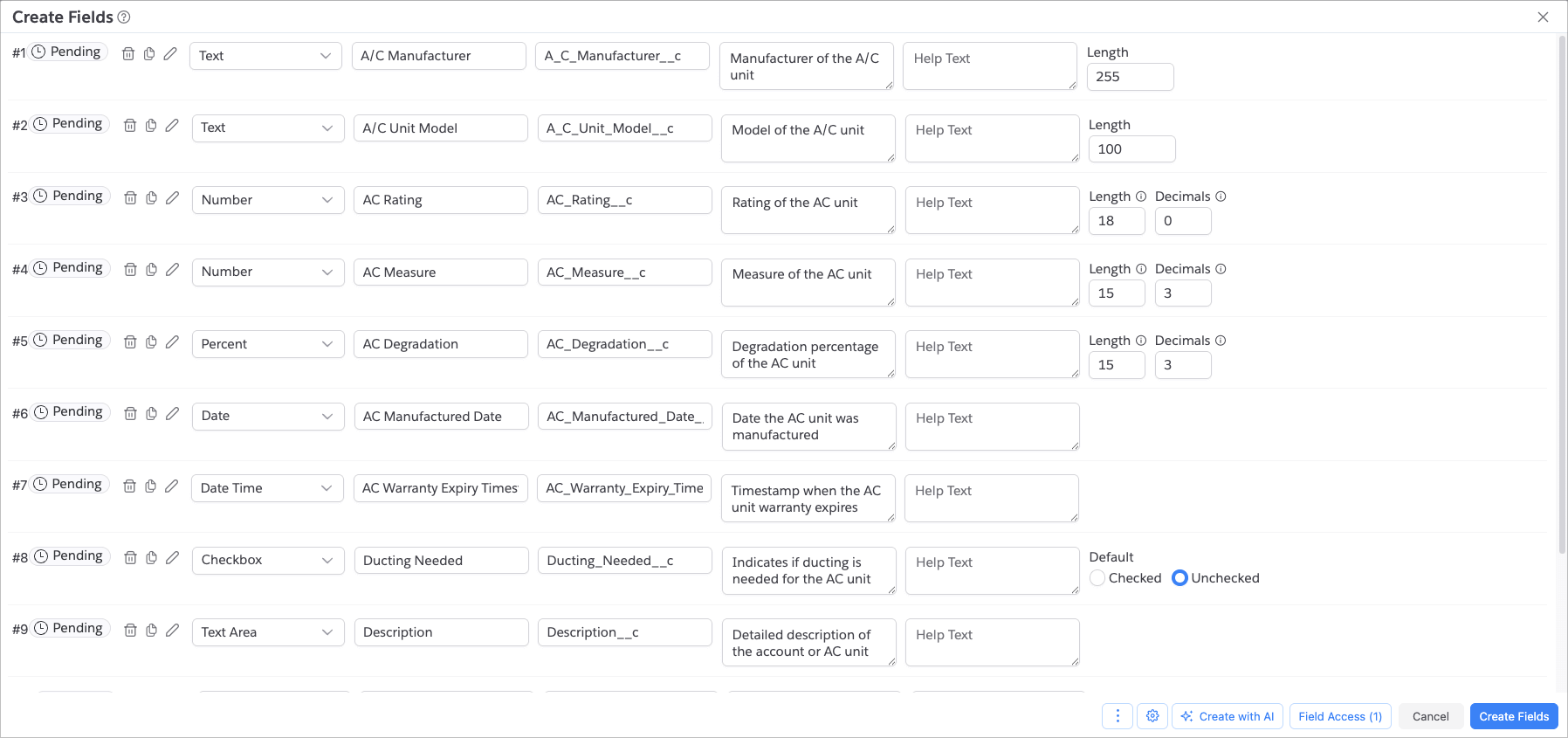 Here you can make any further changes, assign field access, and then finally click Create Fields to create the fields.