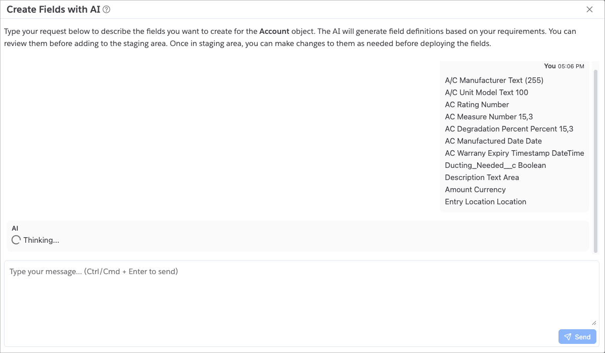 App will process your request using AI and show the generated fields in the below dialog. Note that at this time, fields aren’t created yet.