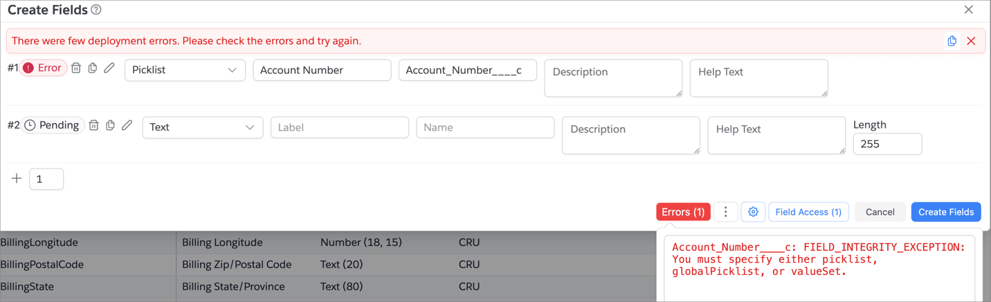 | Access Error | Field is deployed but there are some errors while saving the Field Access configuration |