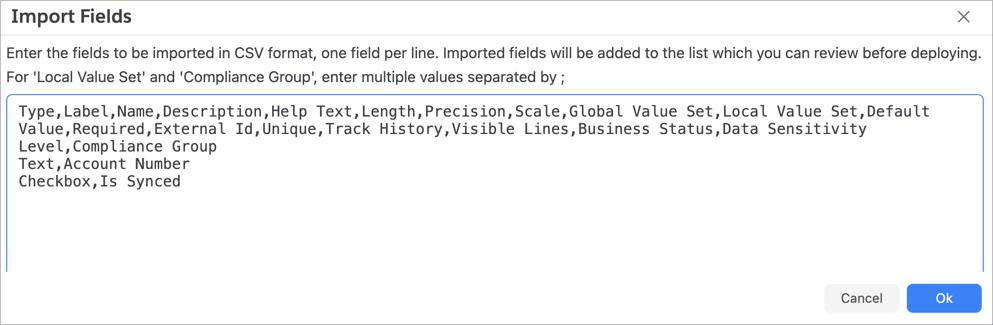 Local Value Set(used for Picklist and Multi Picklist Fields) andCompliance Groupfields, enter the multiple values separated by;(semicolon). This is similar to how multi-picklist values are formatted in Salesforce.