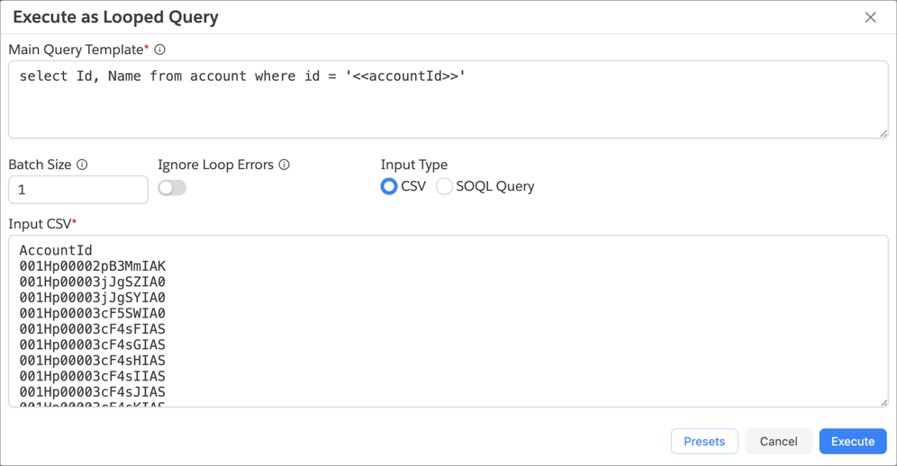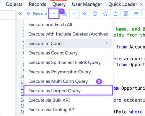 This feature can be invoked by clicking on the dropdown next to Execute button and selecting Execute as Looped Query