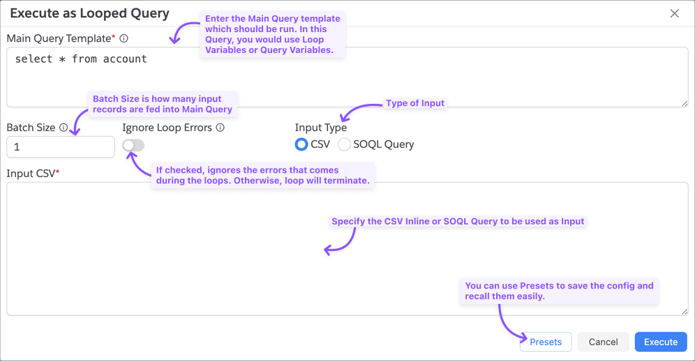 Looped Query feature accepts Main Query Template and Input Dataset and runs the Main Query in repeated manner feeding batch of input records which can be used as variables.