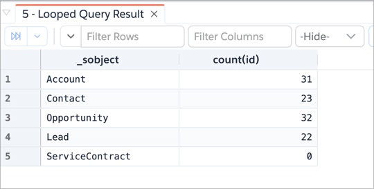 Let's say you want to get a record count of various objects periodically. Typicaly you would need to run each query, collect the count into an Excel file and share that result. With looped query, this is all done with a single click.