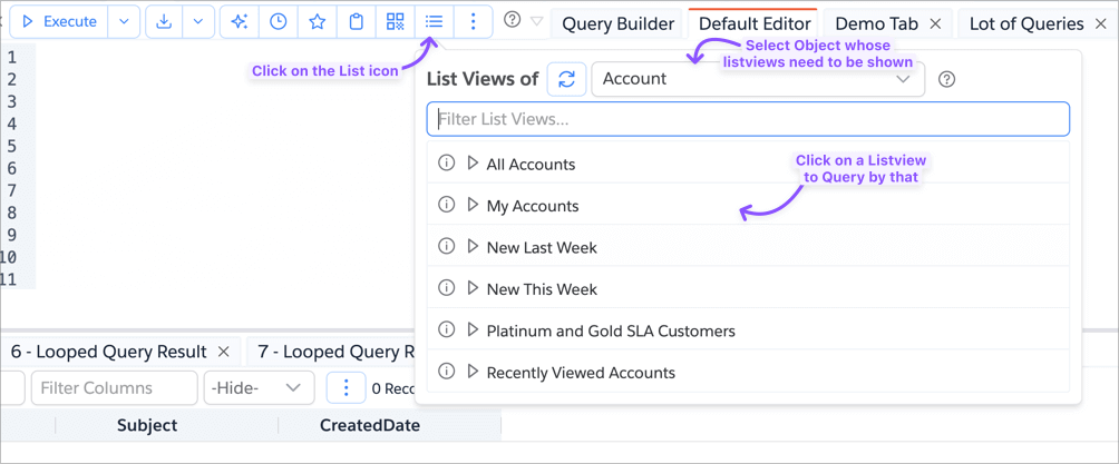 Query by Listviews allows you to query records to mirror the fields/records matched by a Salesforce UI Listview.