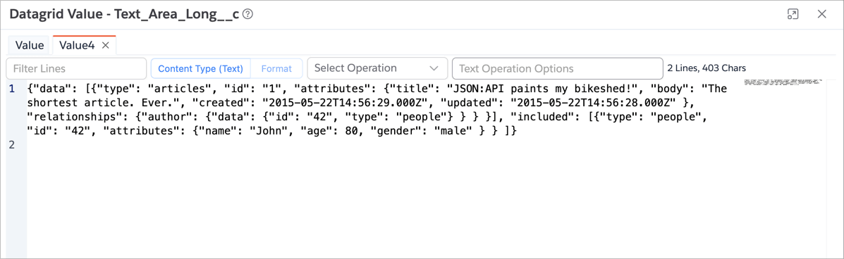 If your text is structured (e.g., JSON, XML, HTML), you can assign an appropriate Content Type to enable syntax highlighting for readability.