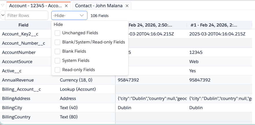 Click on a Record in the top list to see the list of changes for that Record. Record versions are shown in the bottom panel. You can use the filter to hide some of the non-relevant changes like Unchanged fields or system/readonly fields etc.,