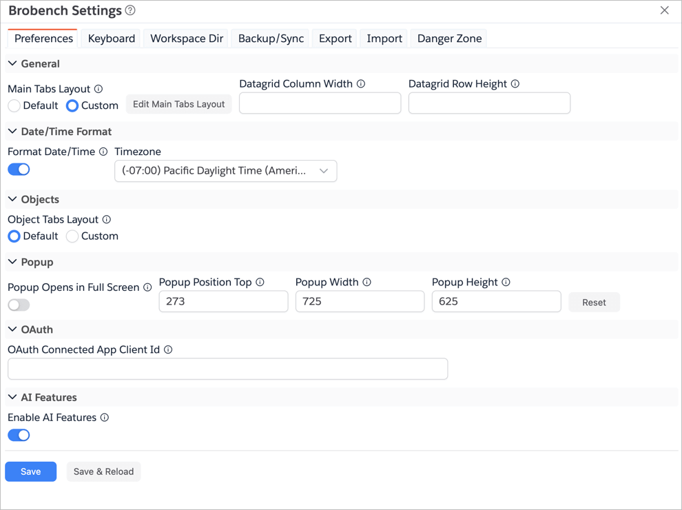 | OAuth Connected App Client Id | If you want to Brobench to use your own OAuth Client Id to connect to Salesforce Orgs, specify the Client Id here. You can use this capability to allow Brobench to connect to your with API Control enabled. |