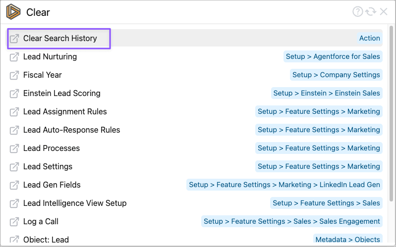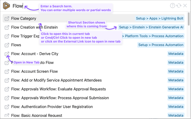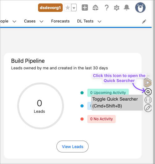 Quick Searcher is a feature that allows you to search for various shortcuts and navigate to them. It is available in the Salesforce UI pages.